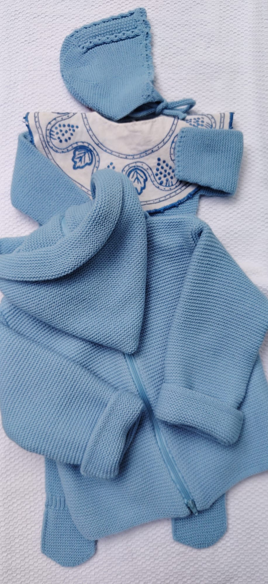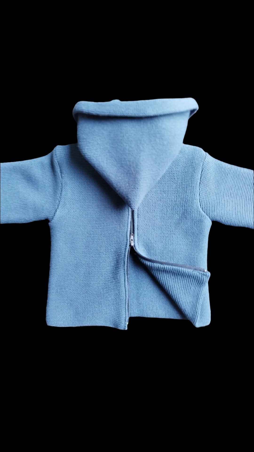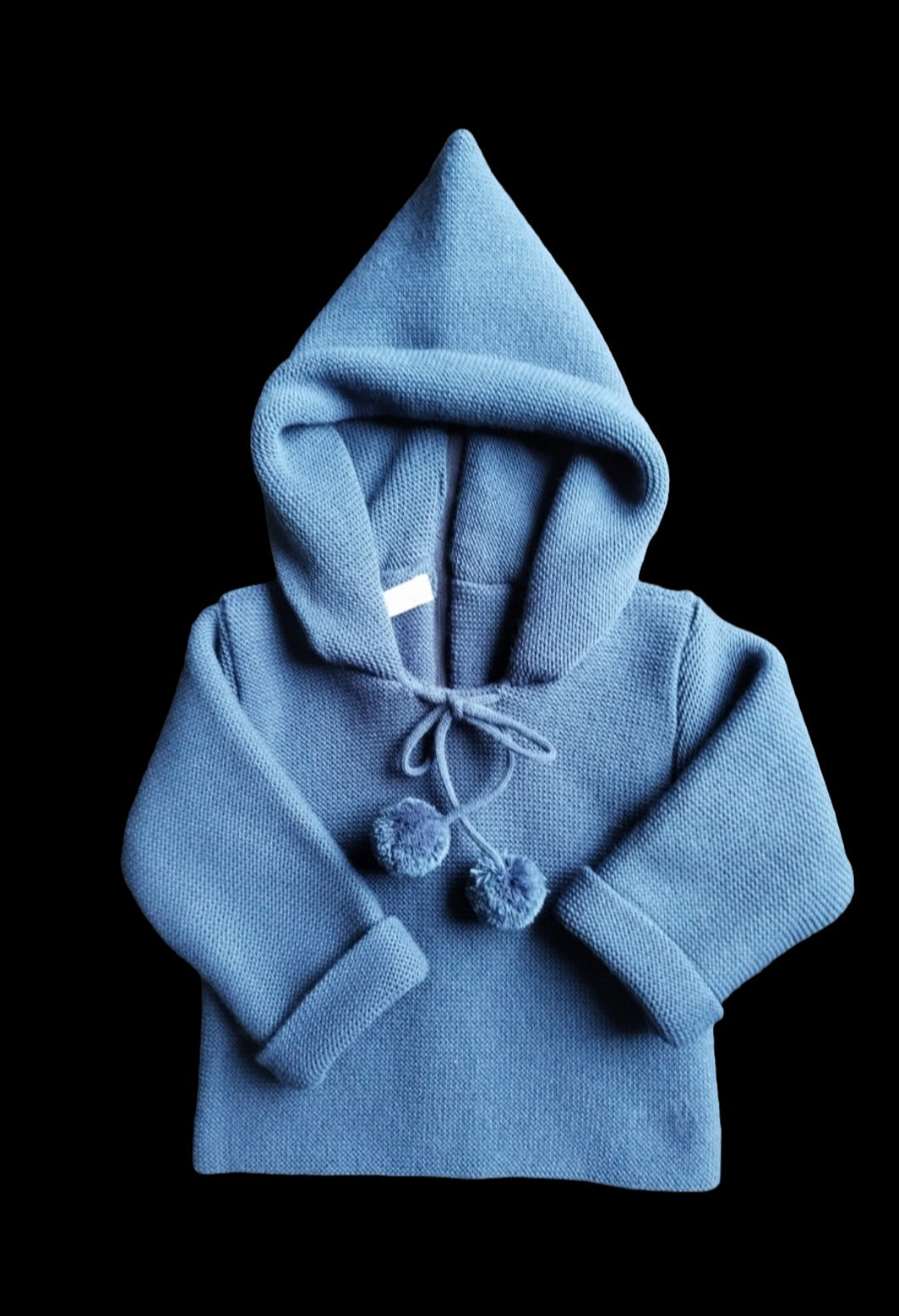 Chaquetón de punto con capucha y cremallera trasera enteriza.