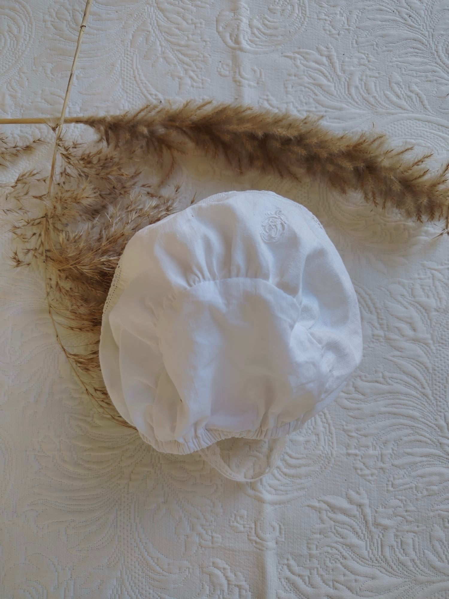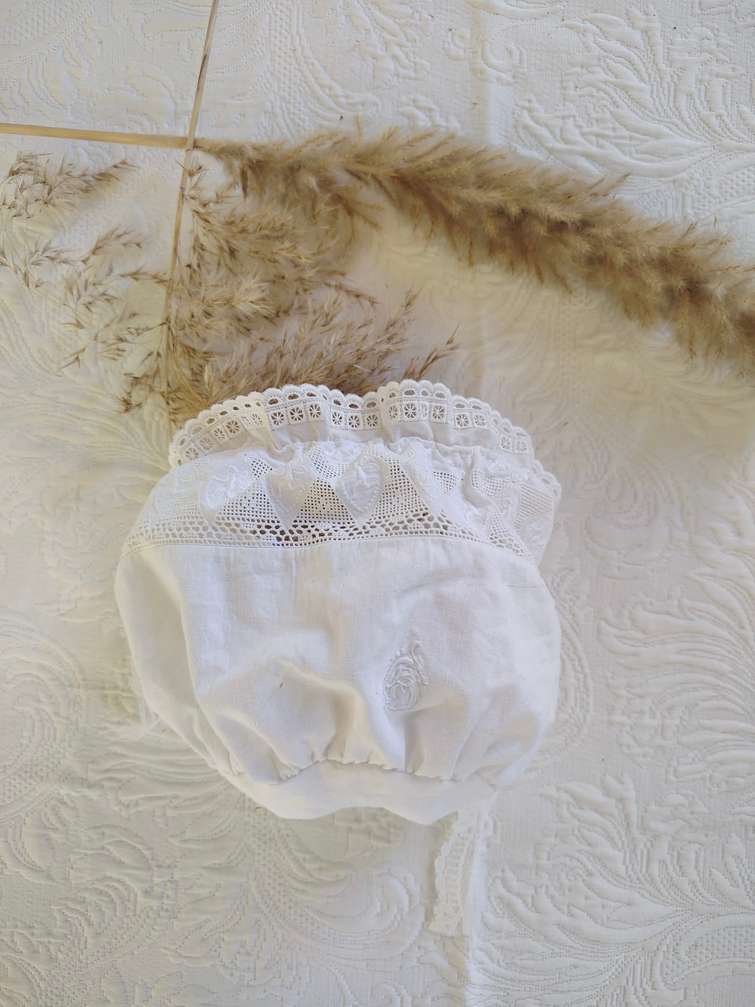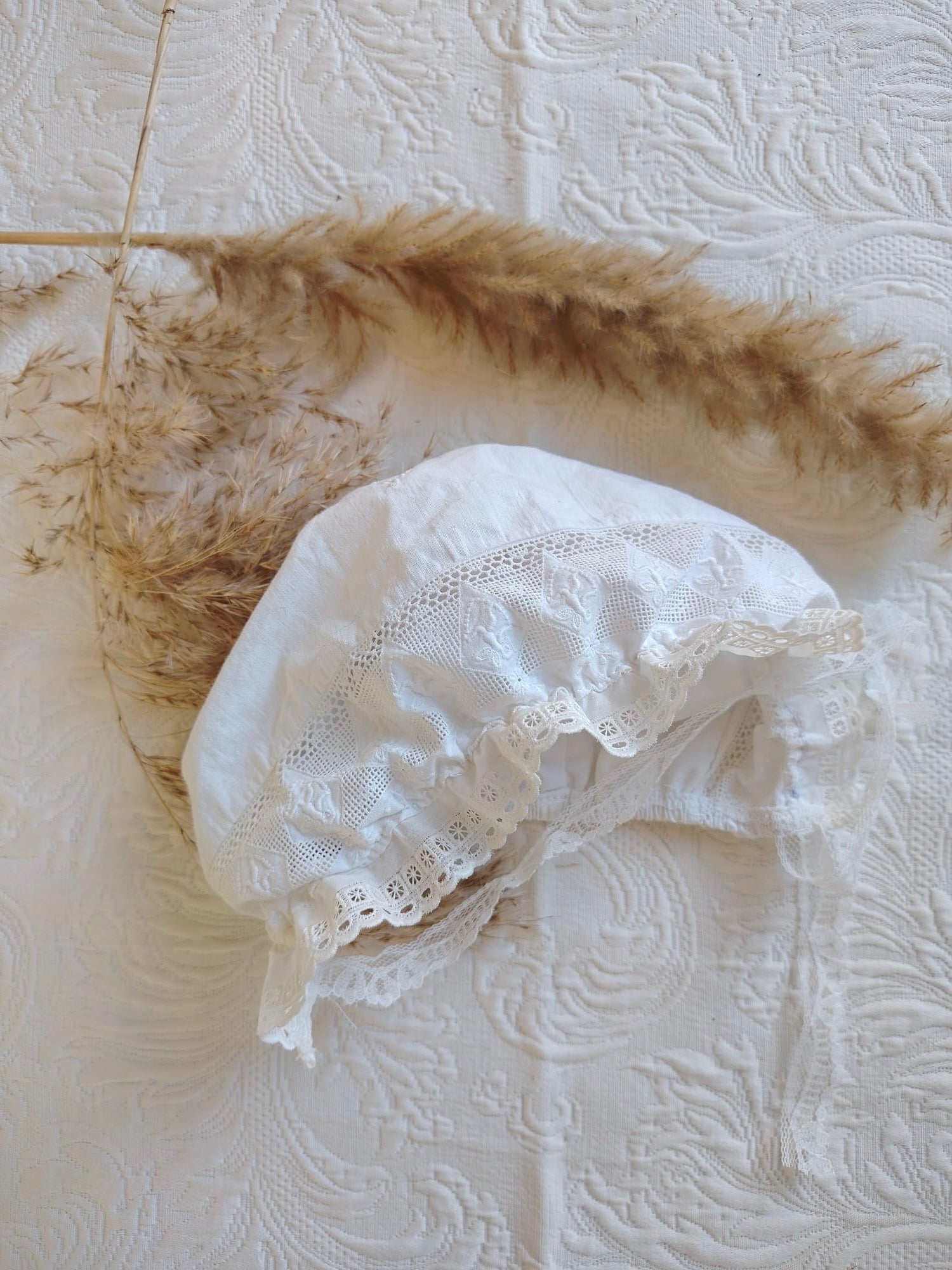 Capota de batista, tira bordada y encaje antiguo.