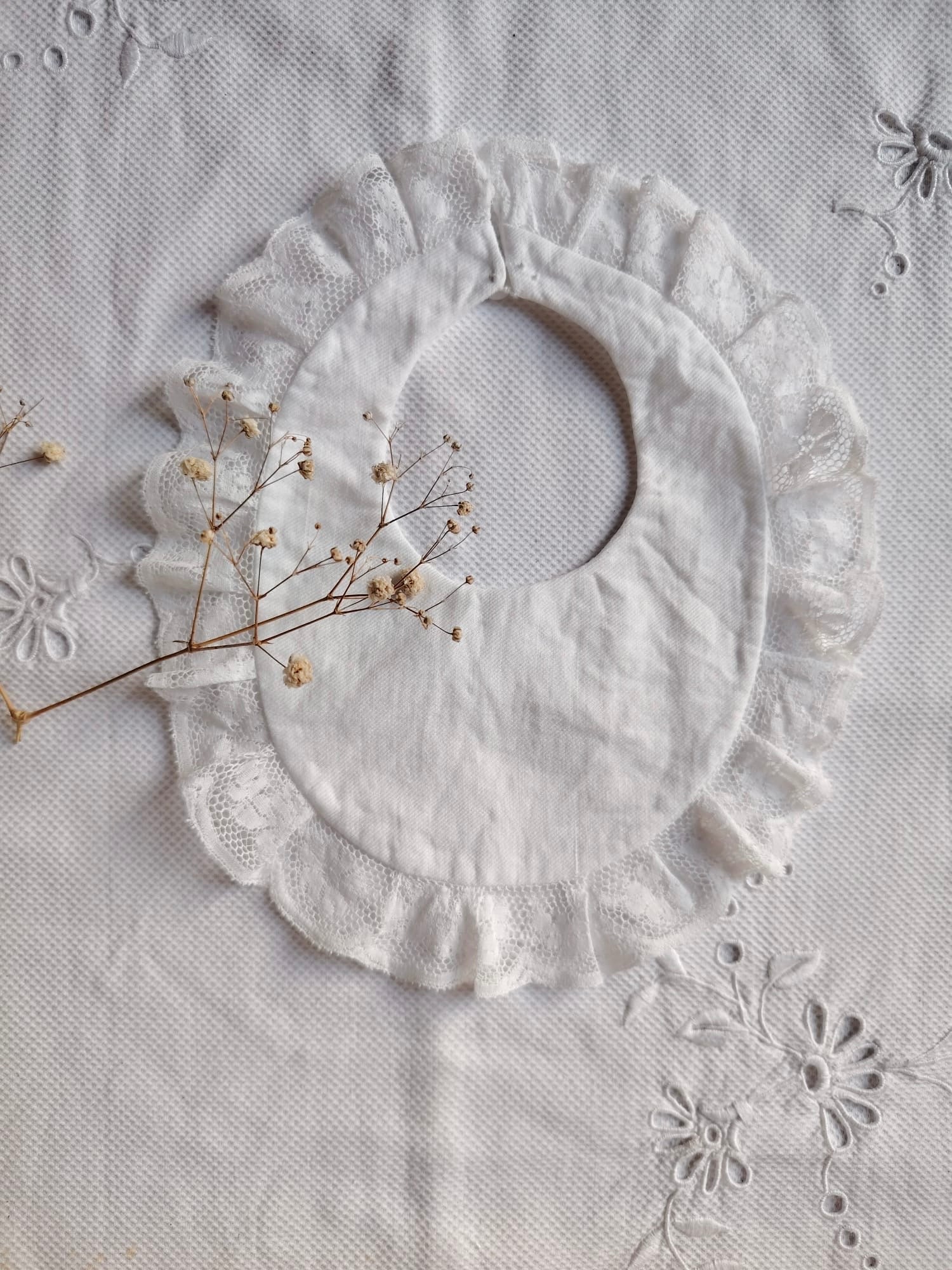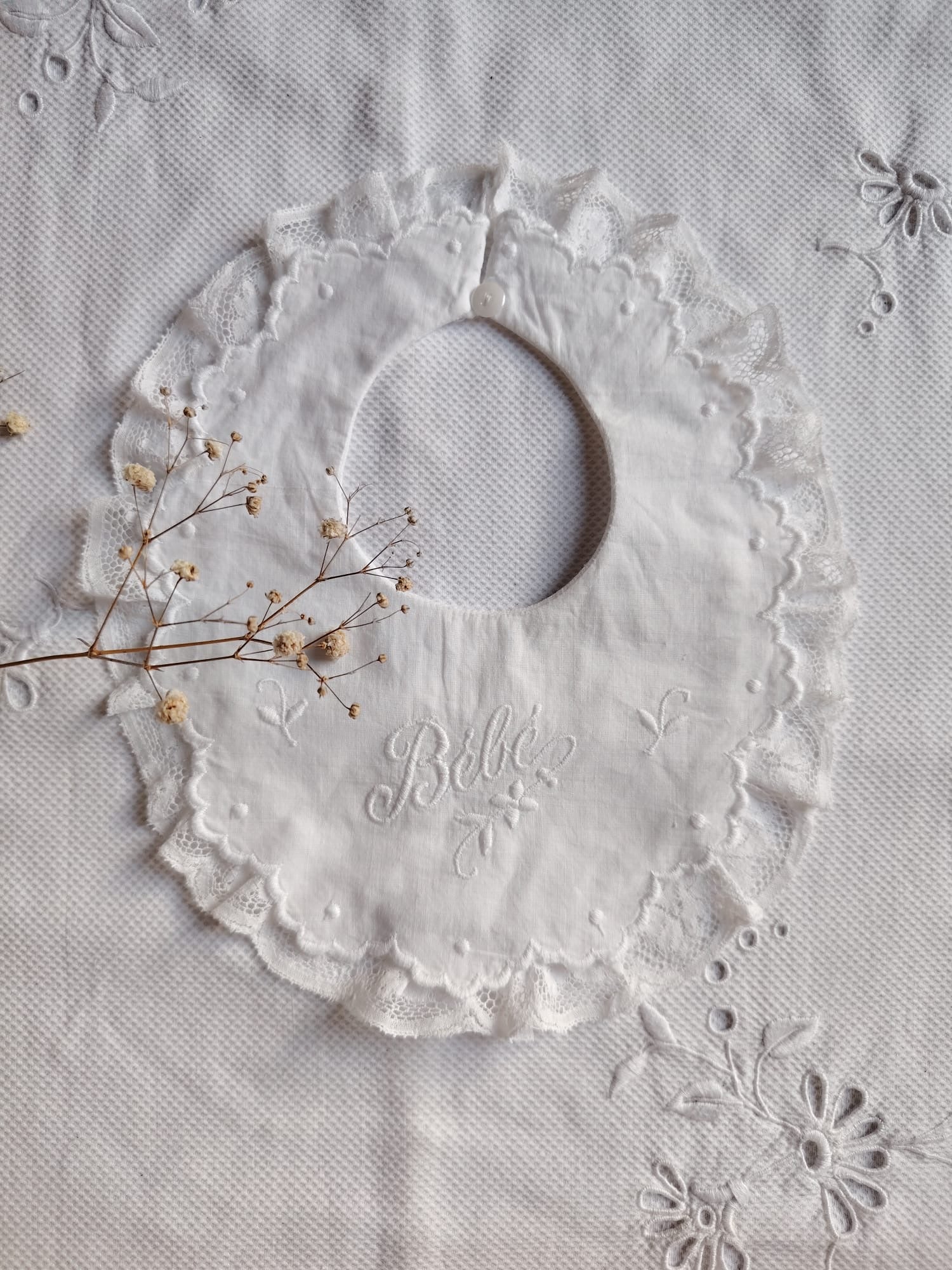 Babero antiguo de Batista bordada y encaje. No admite devolución.