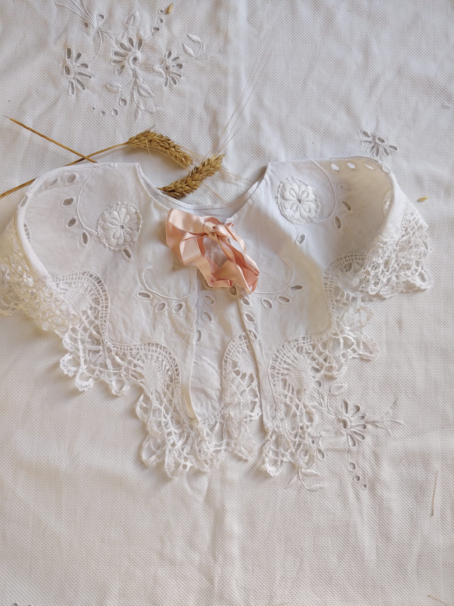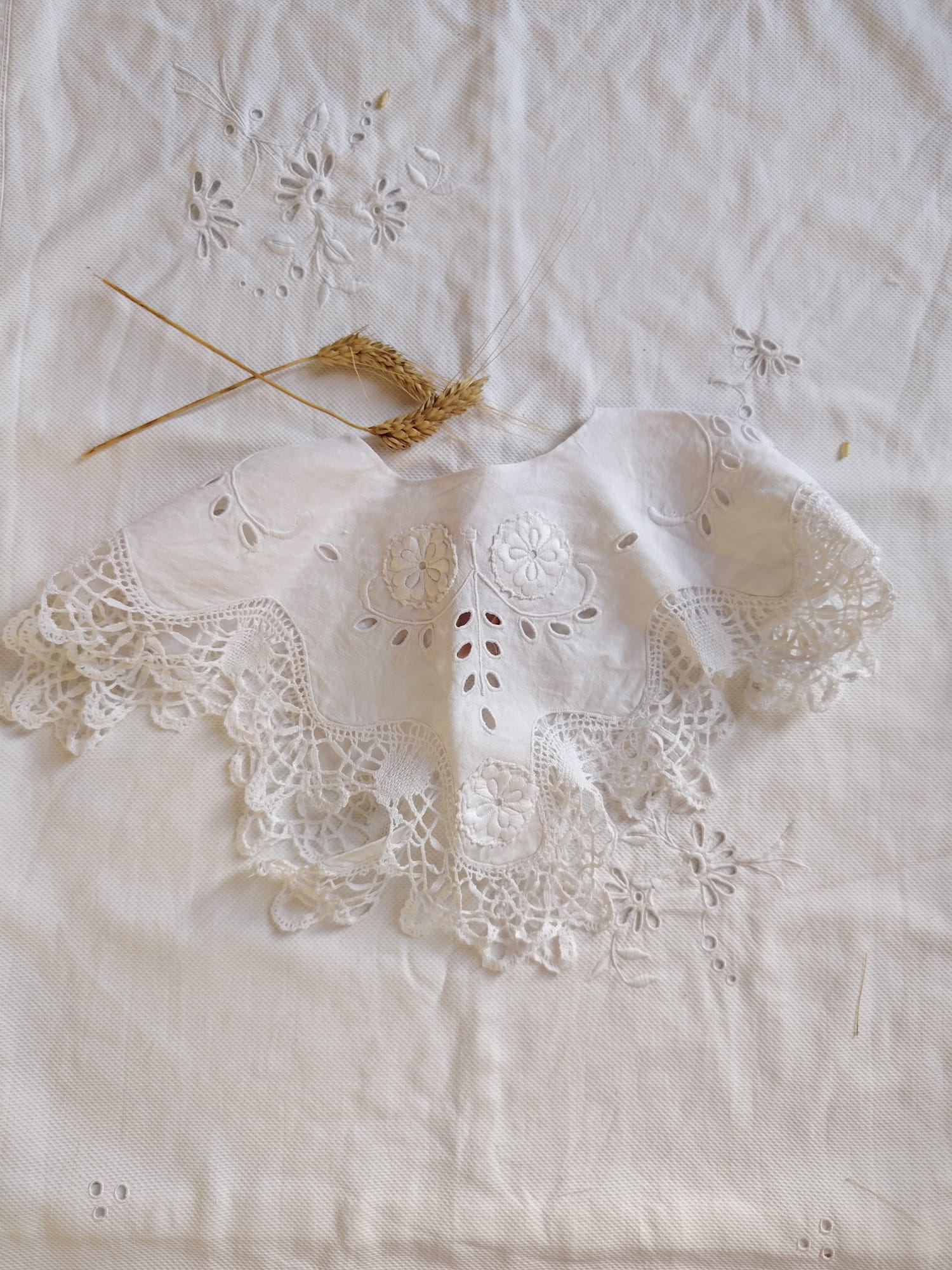 Cuello antiguo de lino bordado con encaje. No admite devolución.