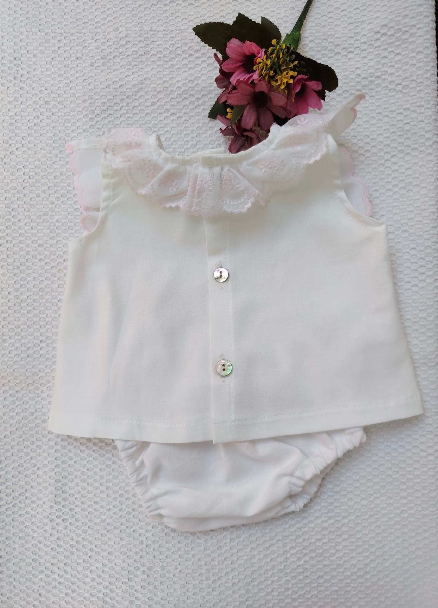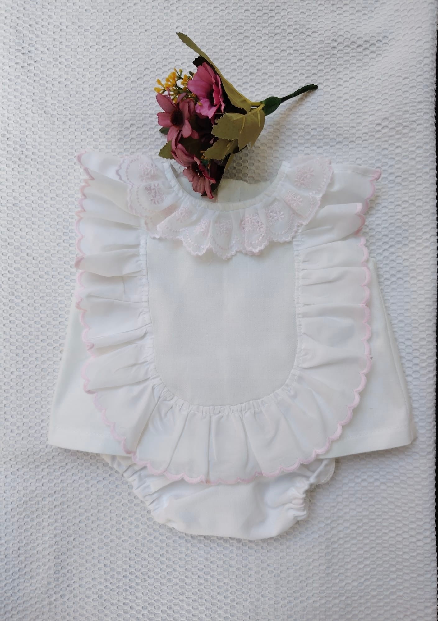 Jesusito de villela con tira bordada en rosa y cubre compañero.