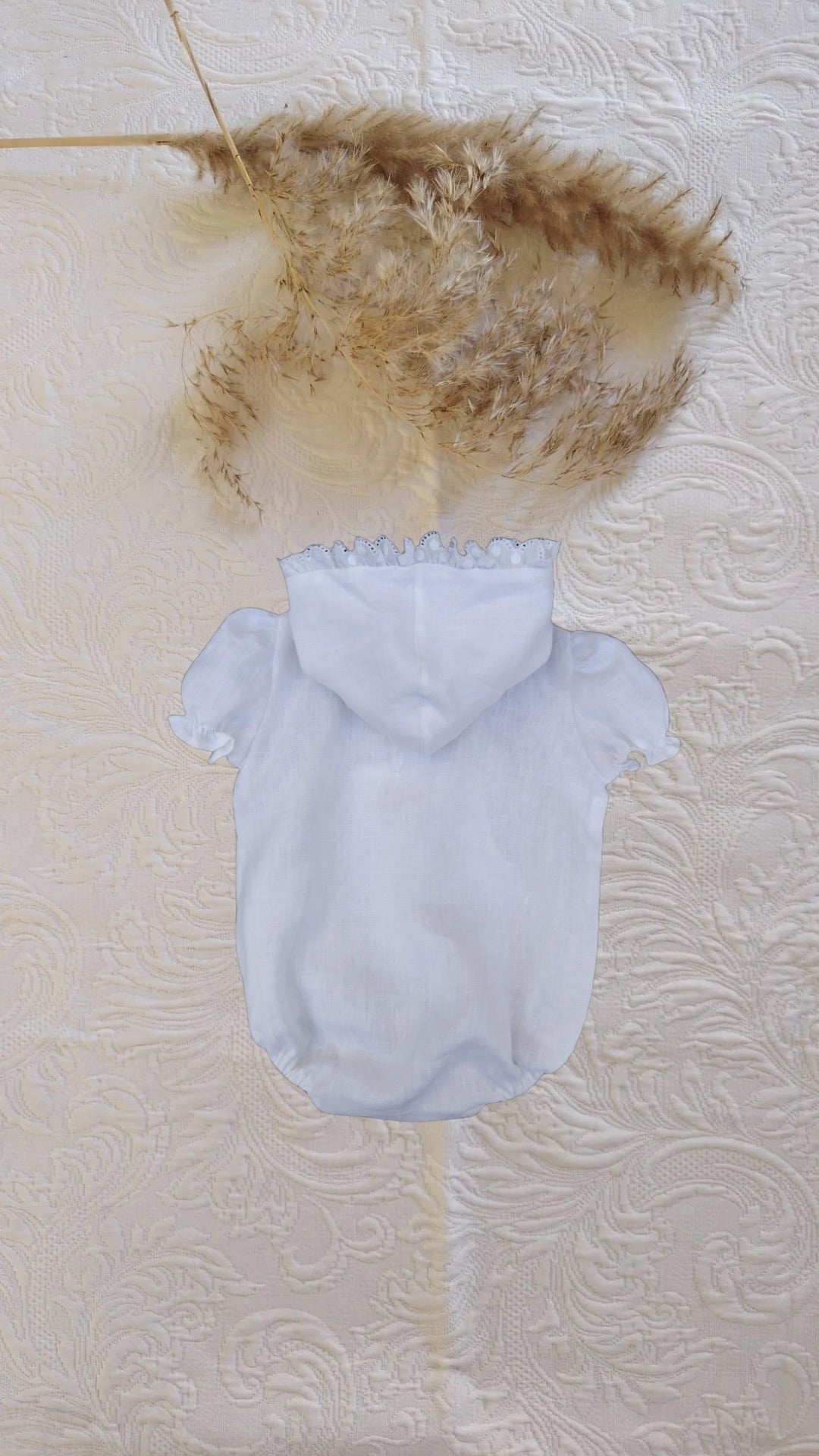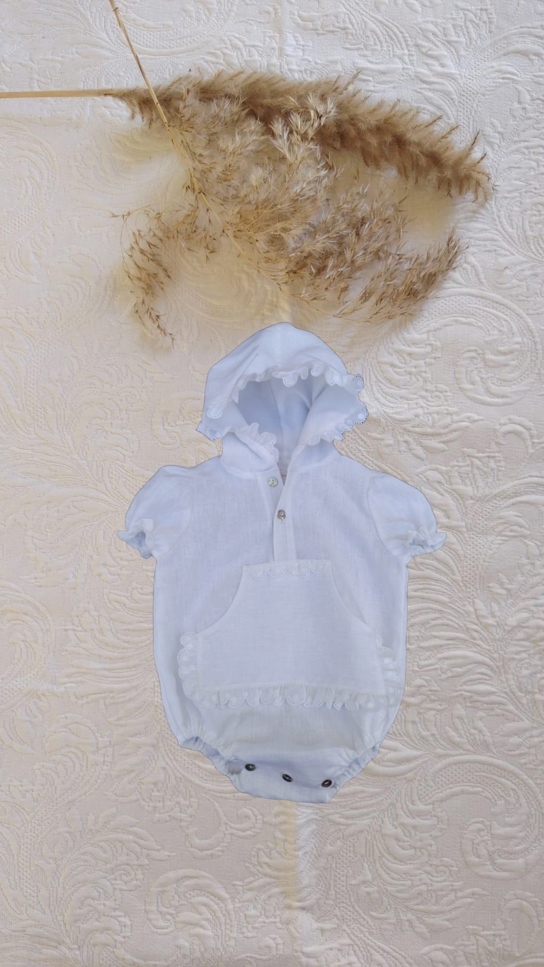 Pelele de lino blanco con capucha y bolsillo ribeteado en tira bordada.