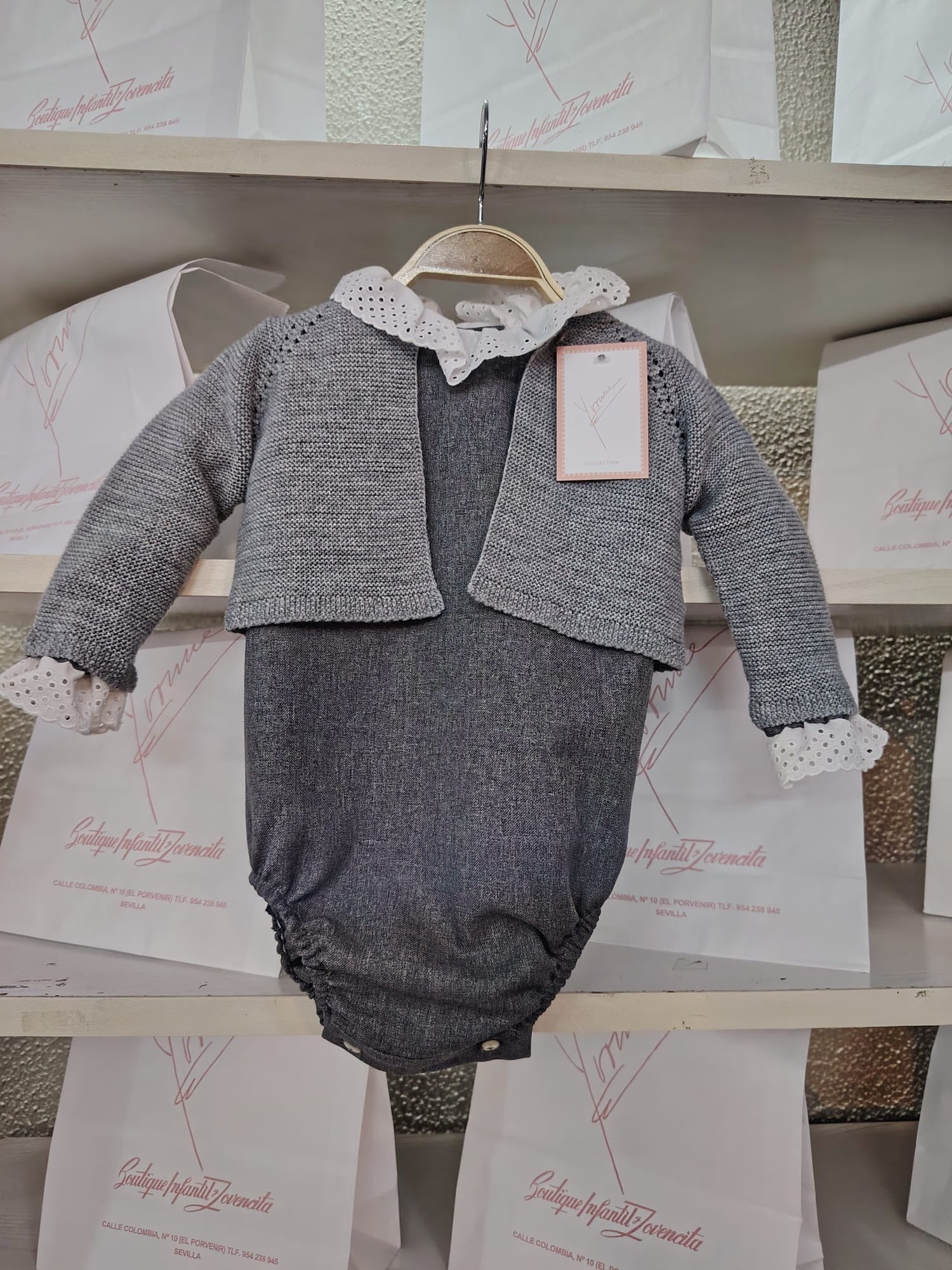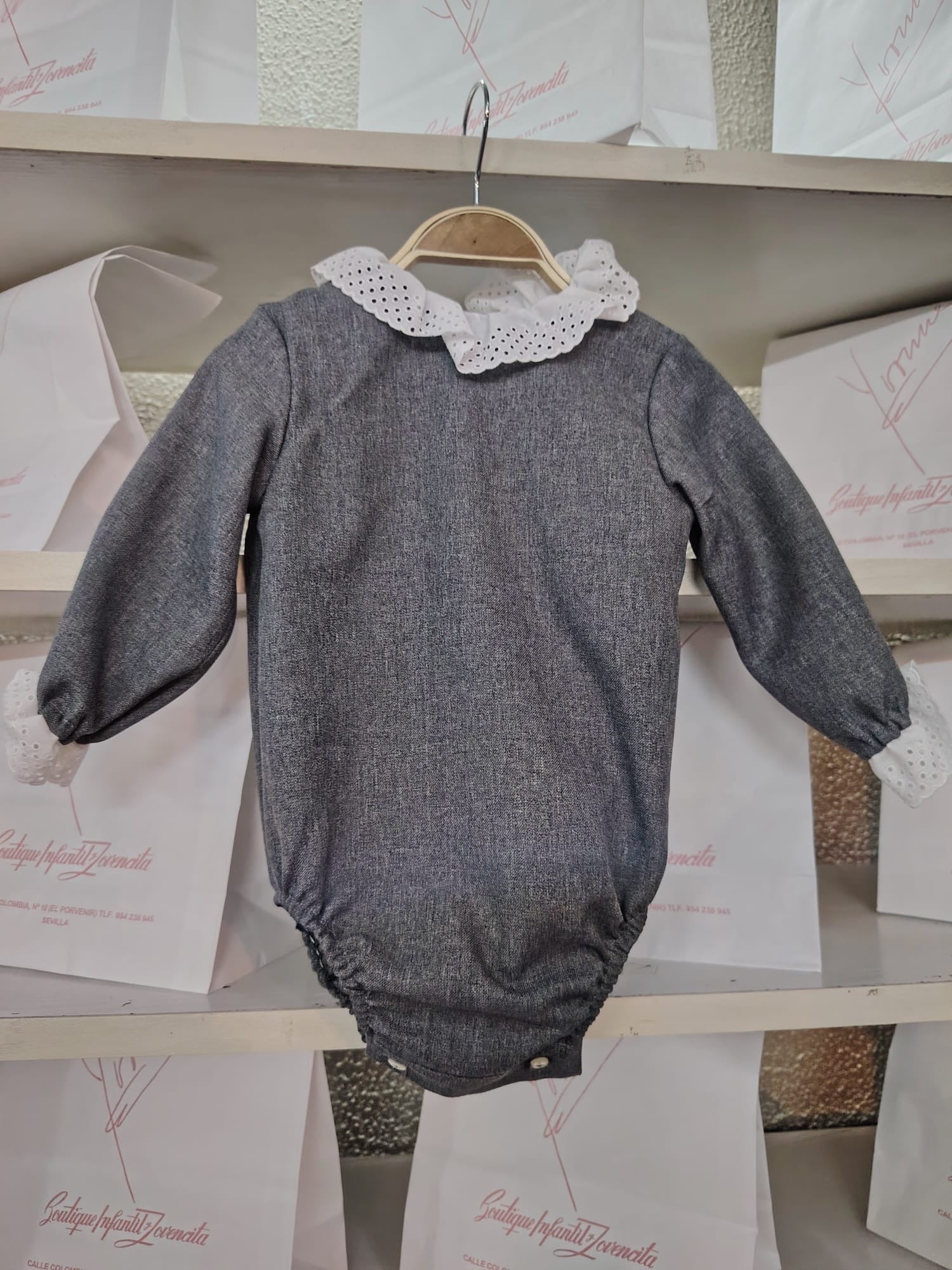 Pelele de villela gris,manga larga con cuello y puños de tira bordada.