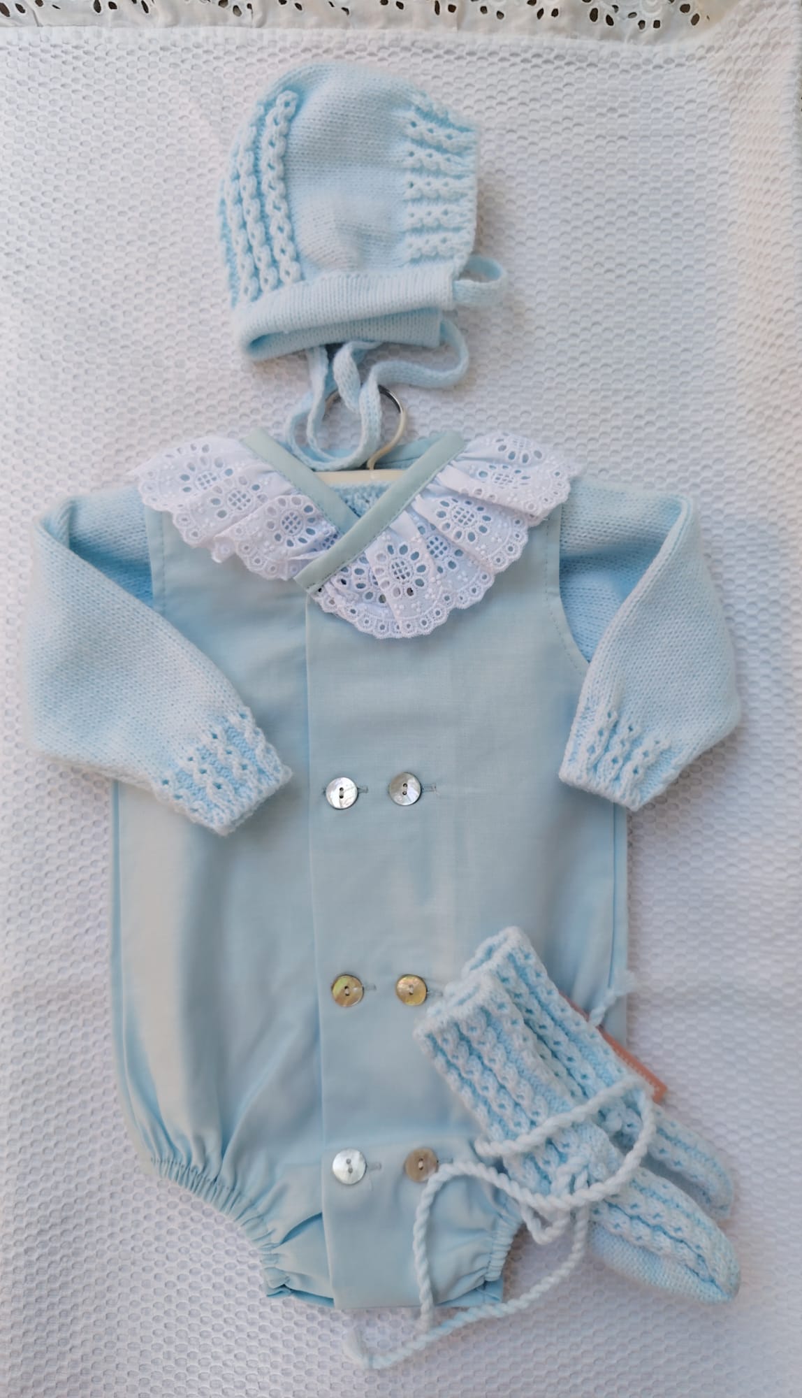 Pelele de villela celeste y cuello cruzado de tira bordada.
