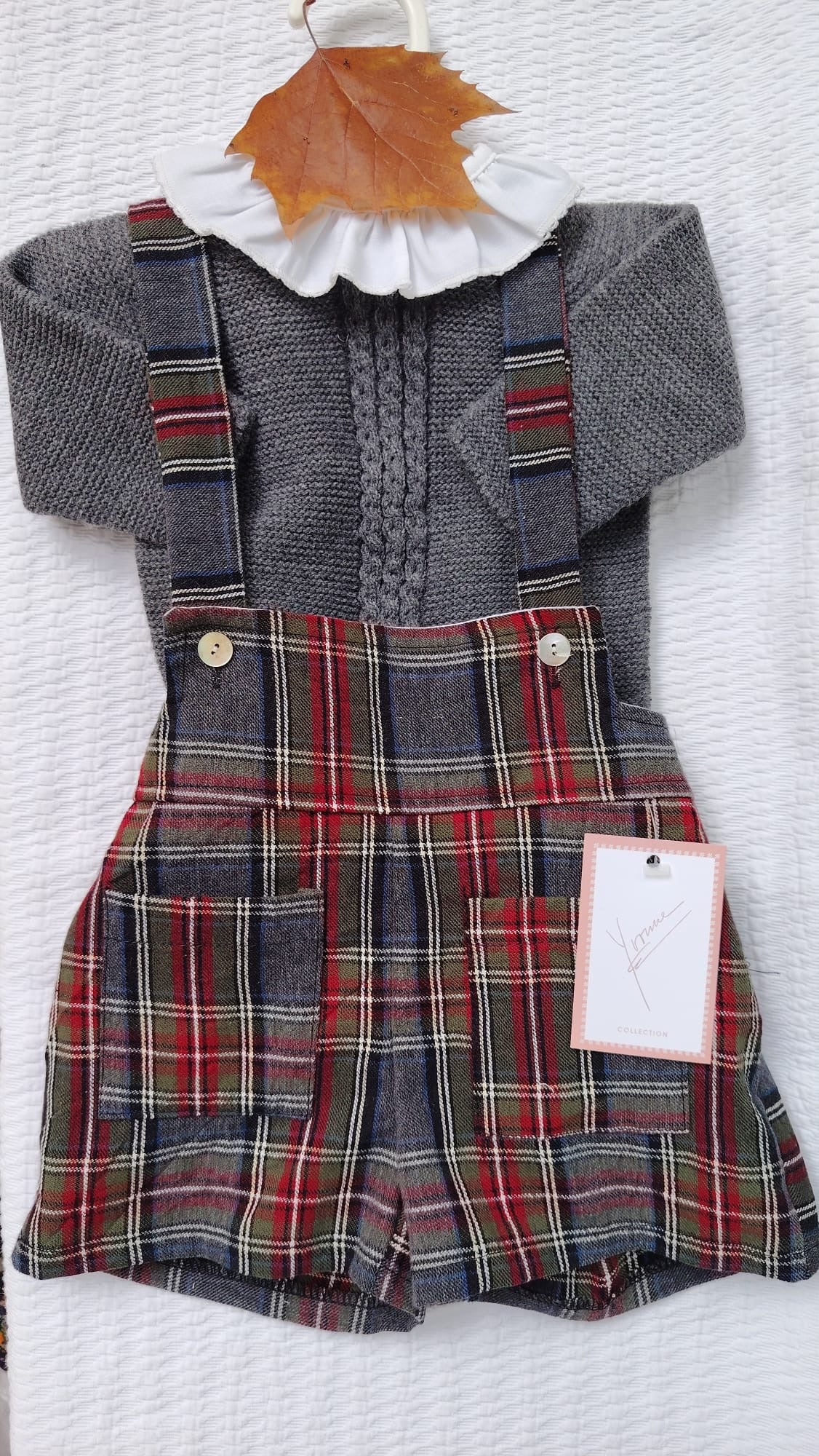 Pantalo corto con peto y bolsillos, tela escocesa tono grises y burdeos.