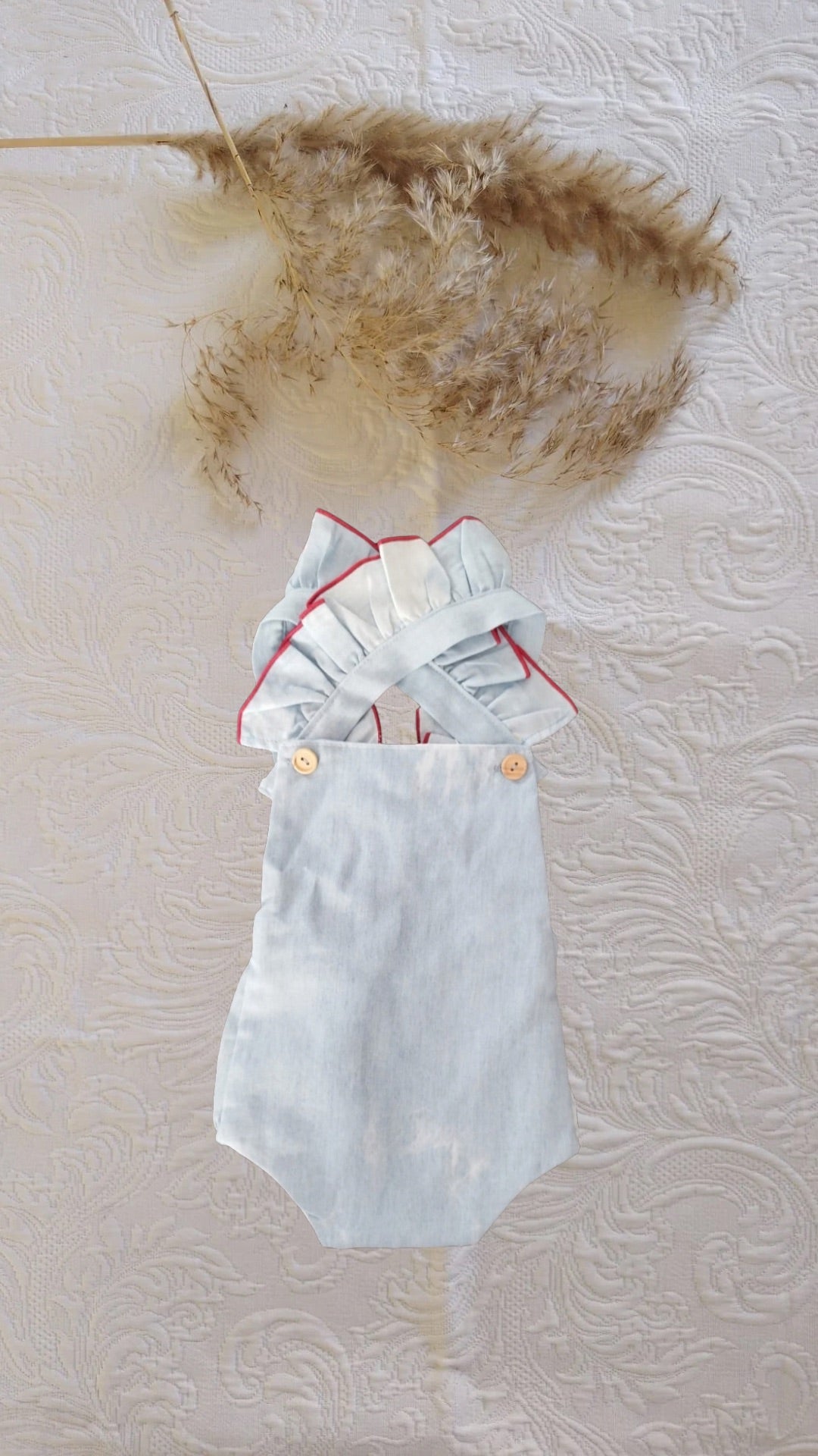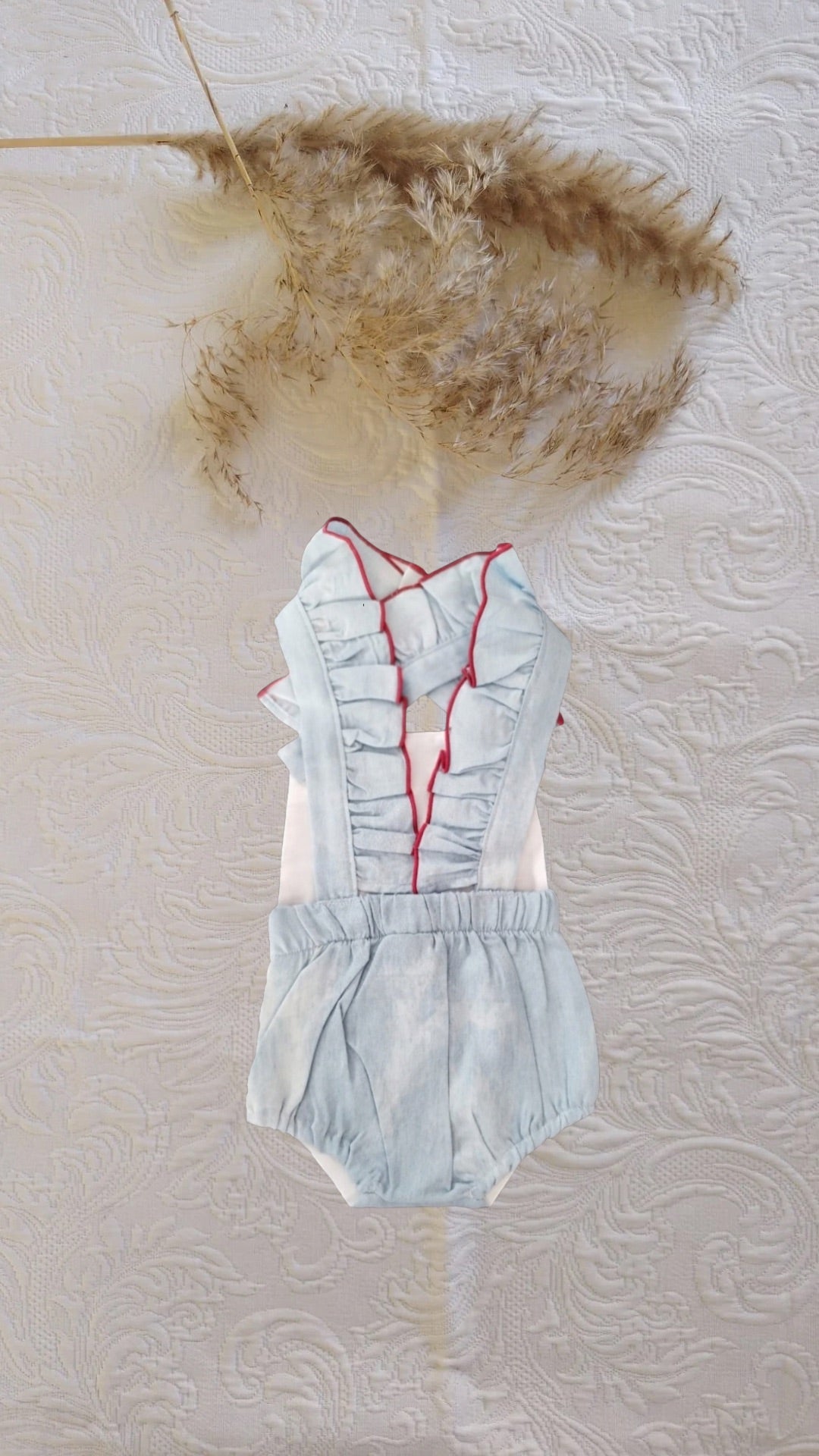 Tirantas con volantes rematados en color rojo granate.