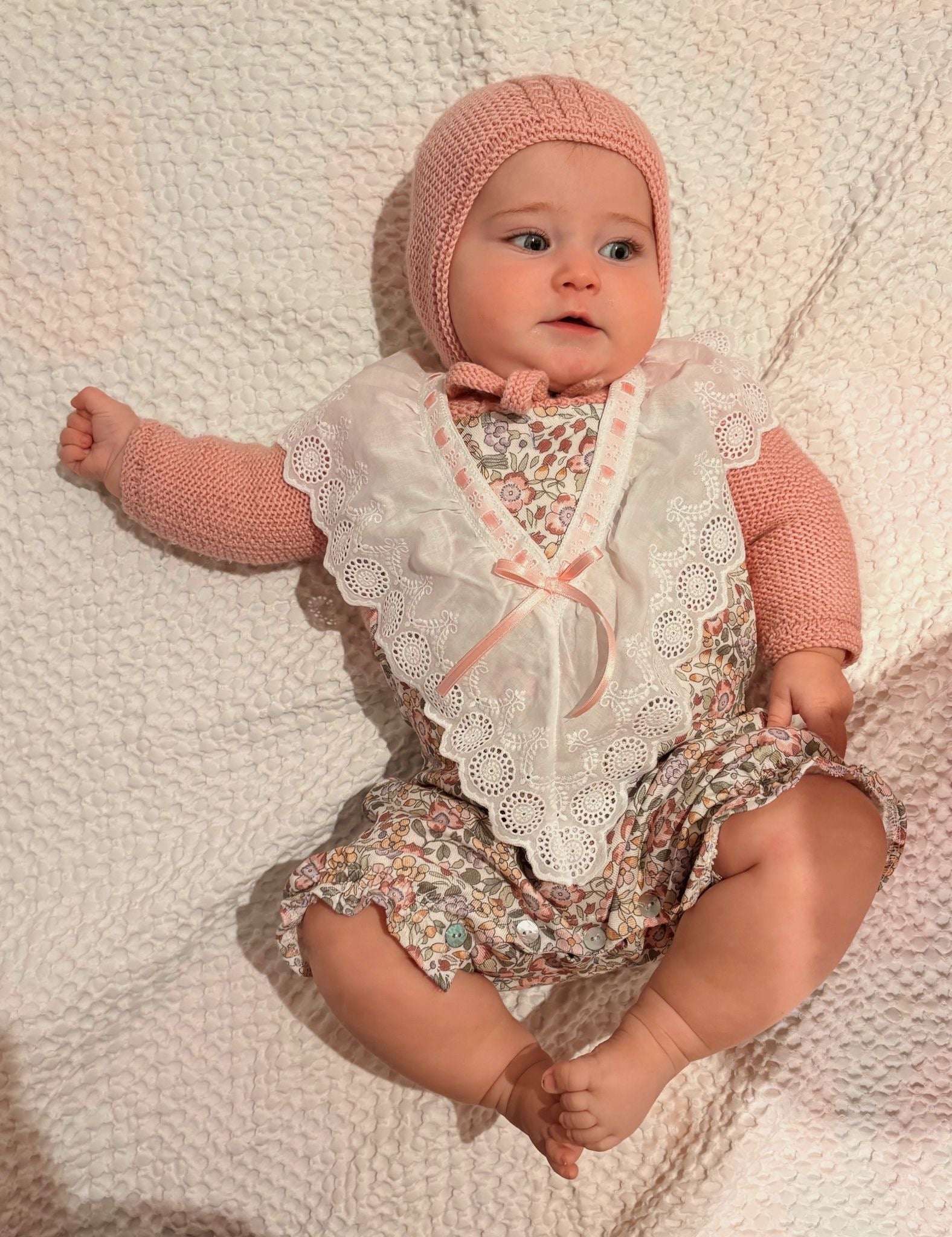 Ranita de villela estampada en rosa, adornos de tira bordada en pico con pasa cinta rosa.