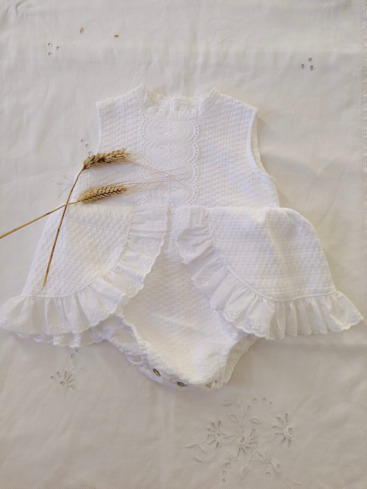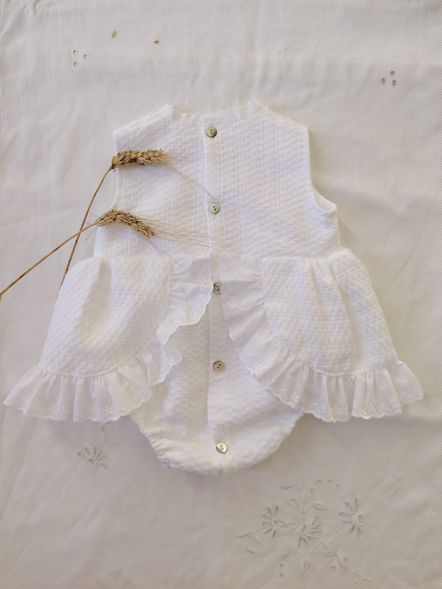 Cortado con volantes laterales rematados en tiras bordadas.