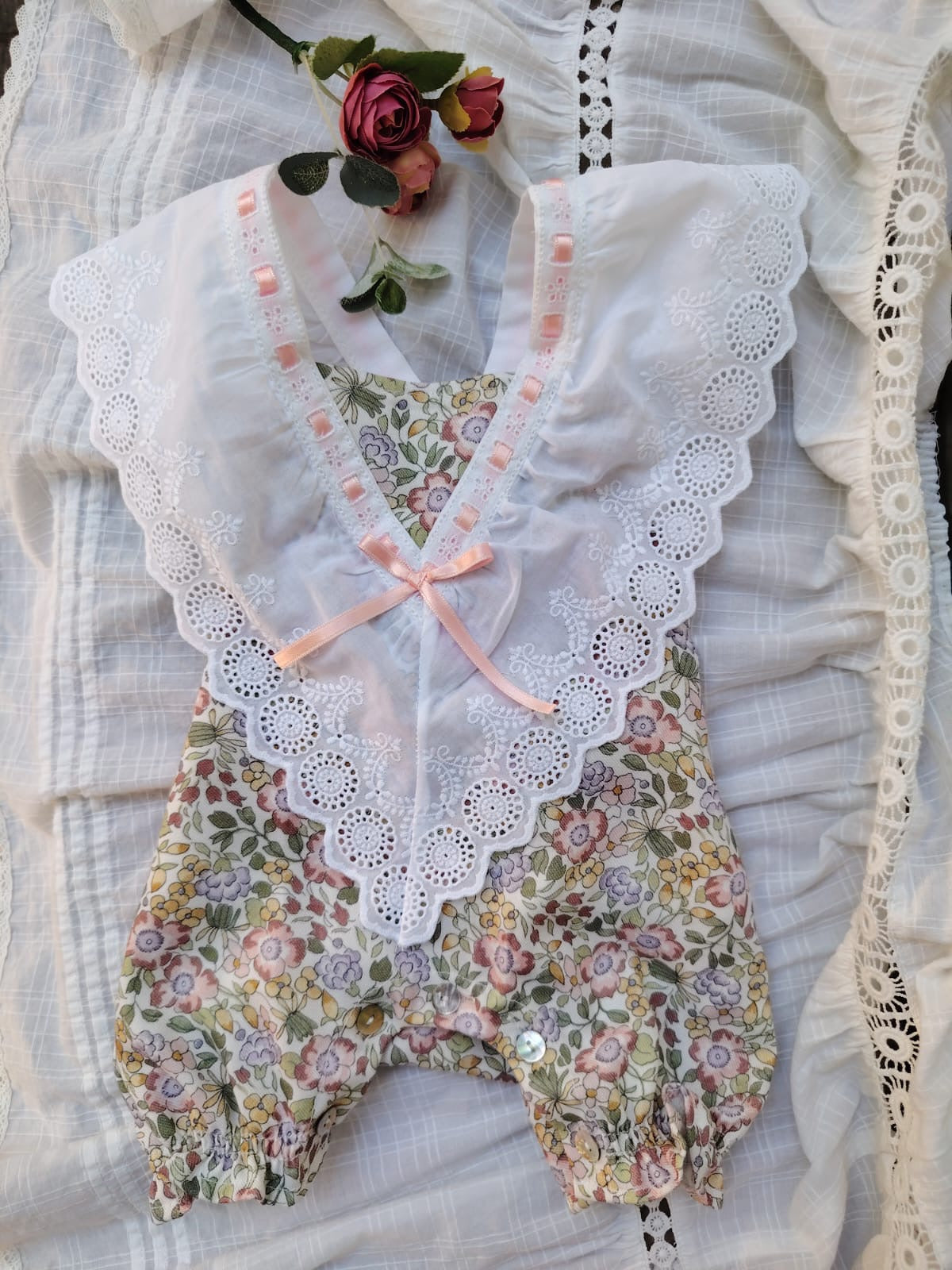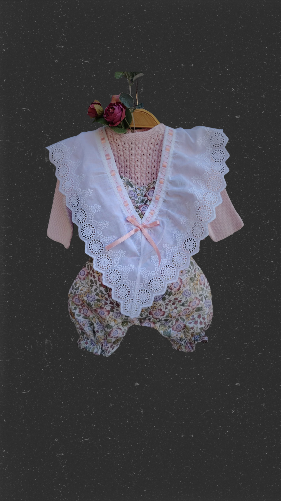 Ranita de villela estampada en rosa, adornos de tira bordada en pico con pasa cinta rosa.