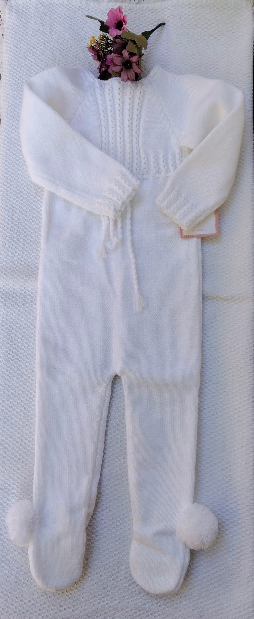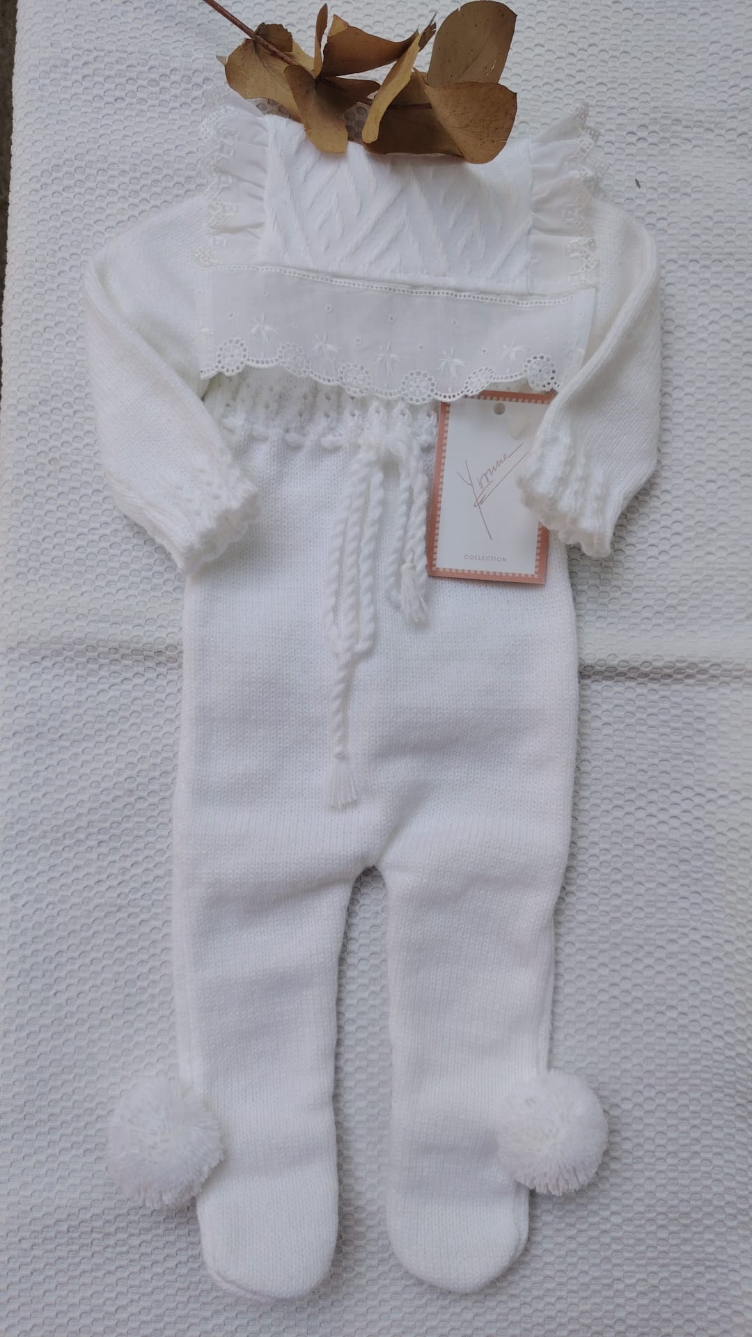 Mono enterizo blanco de punto,cuerpo de ochitos.