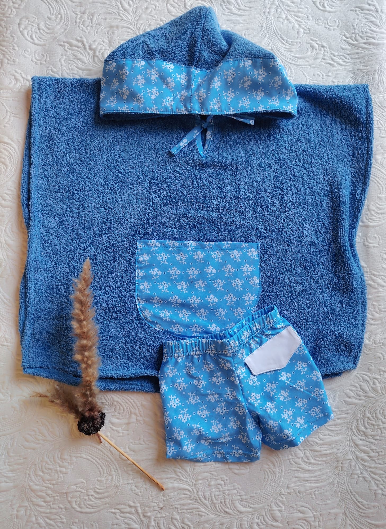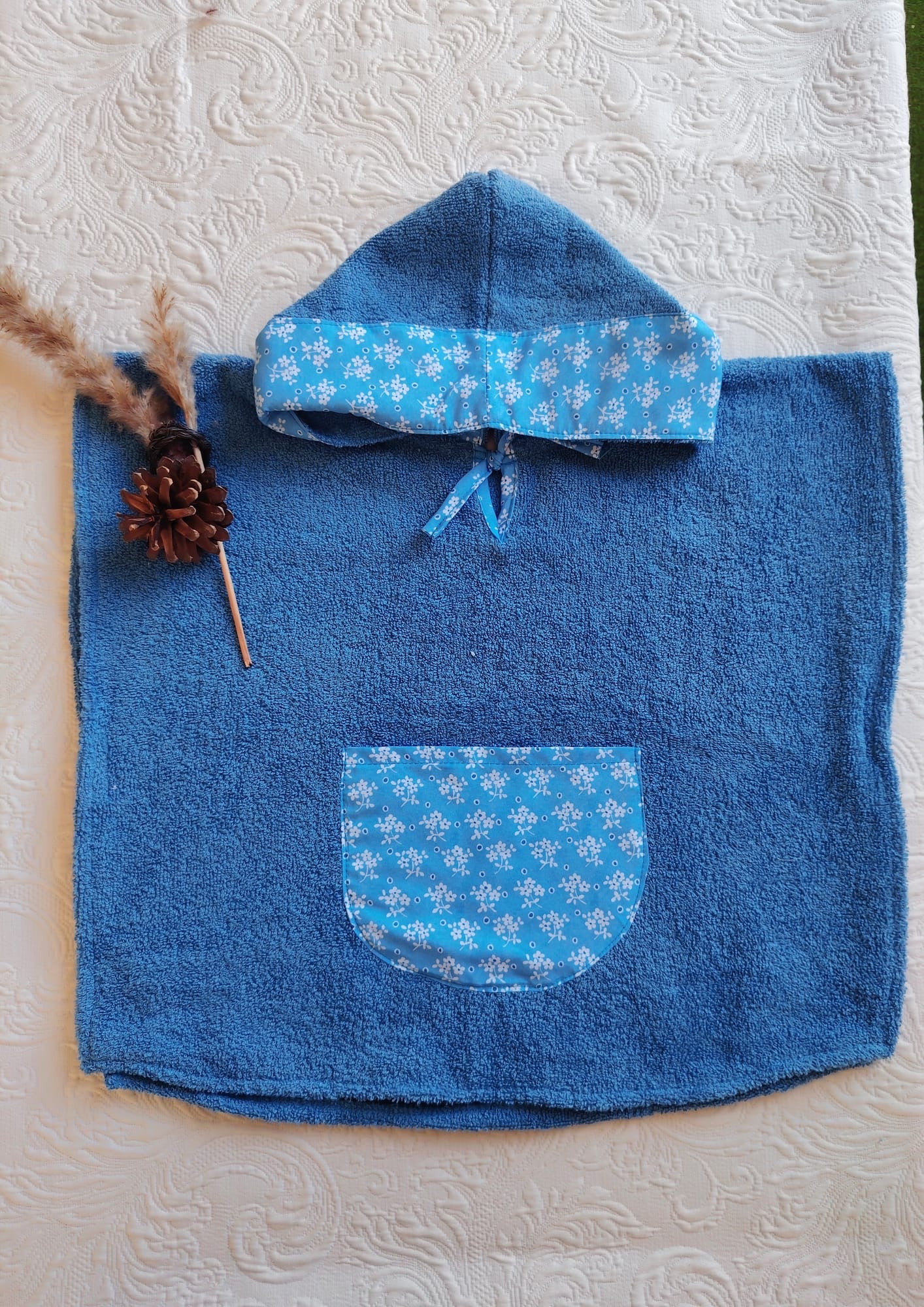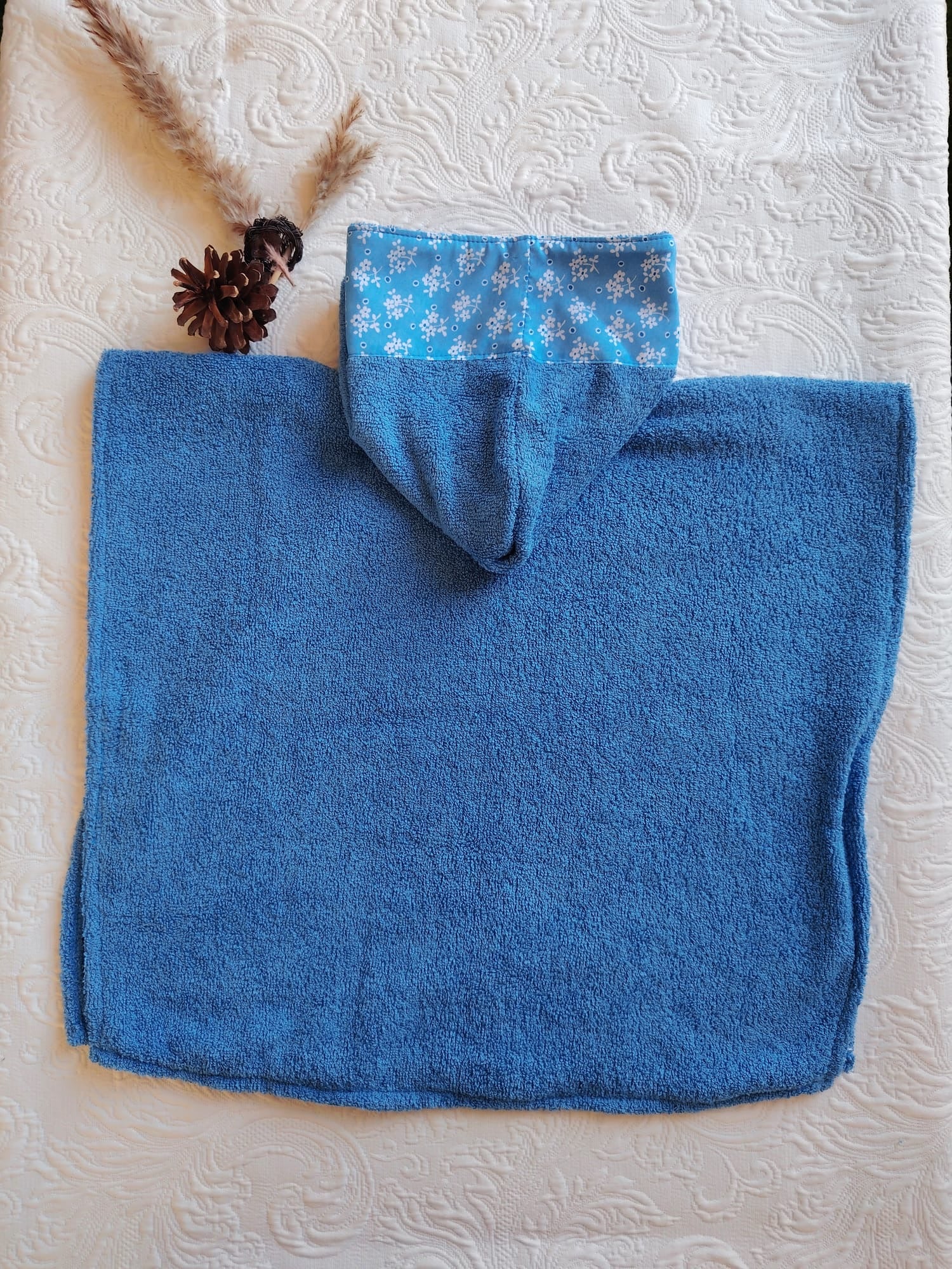 Poncho de felpa color azulón combinado con tela estampada.