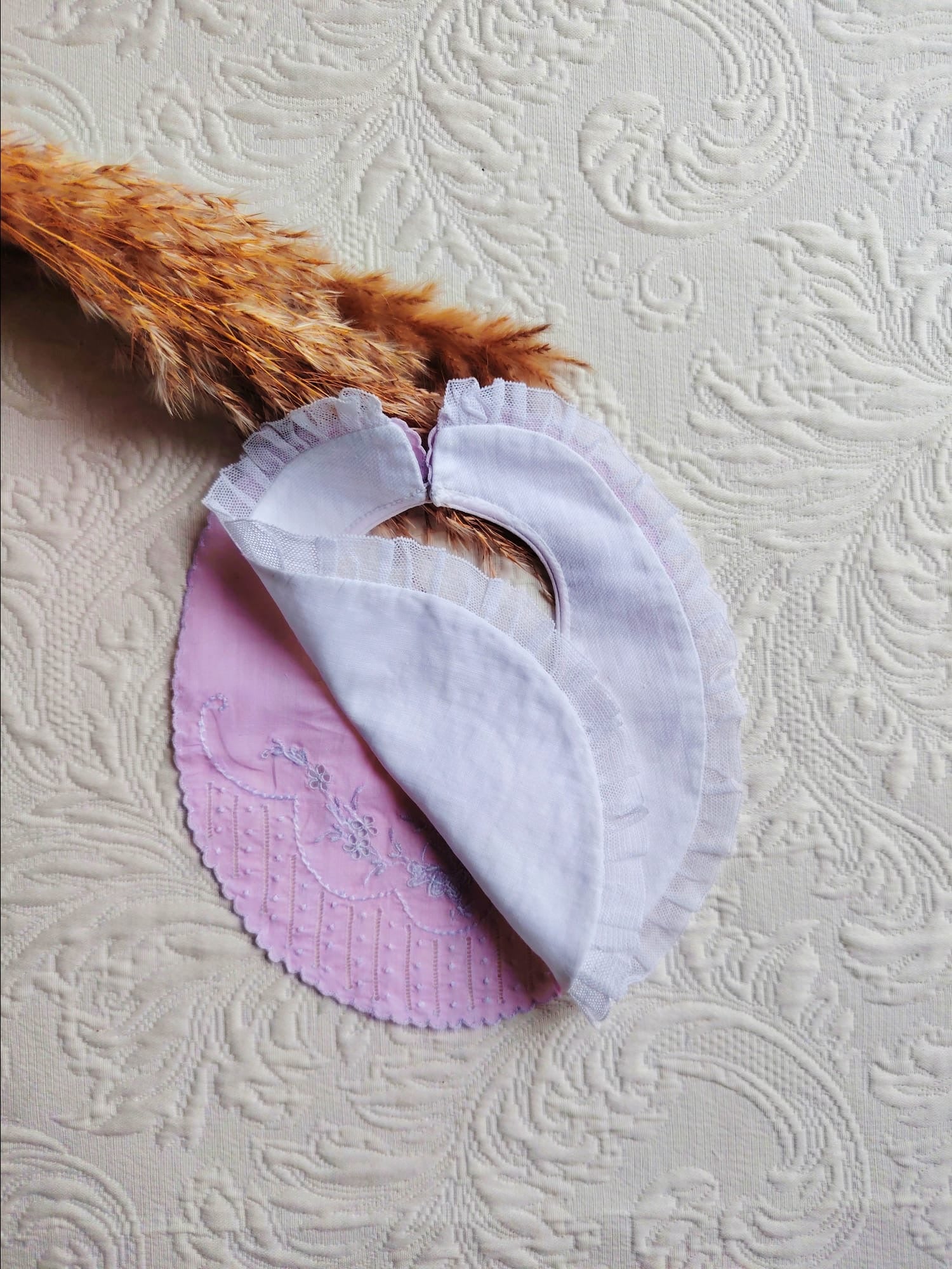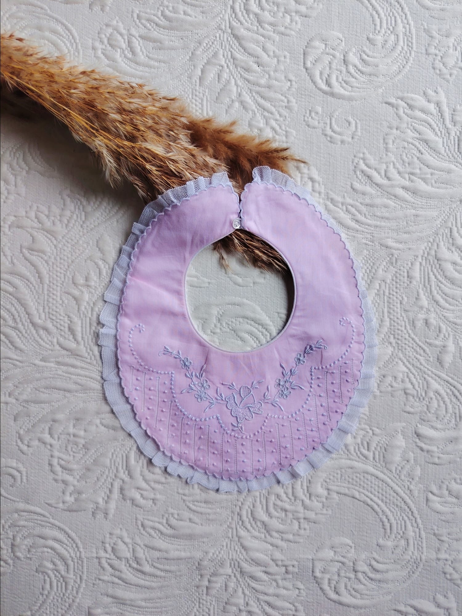Babero de primera postura de batista rosa bordado a mano y punta de feston. No admite devolución.