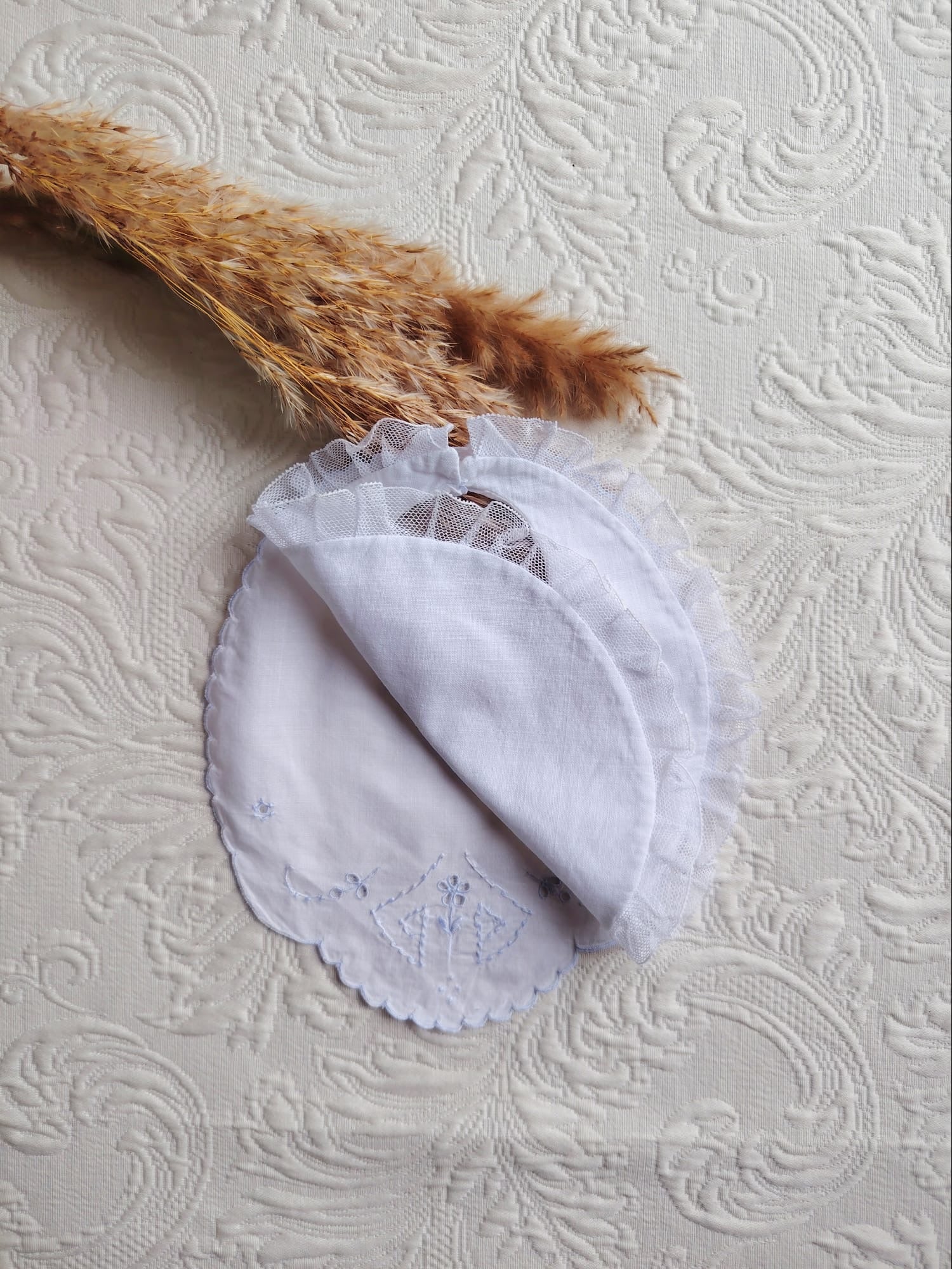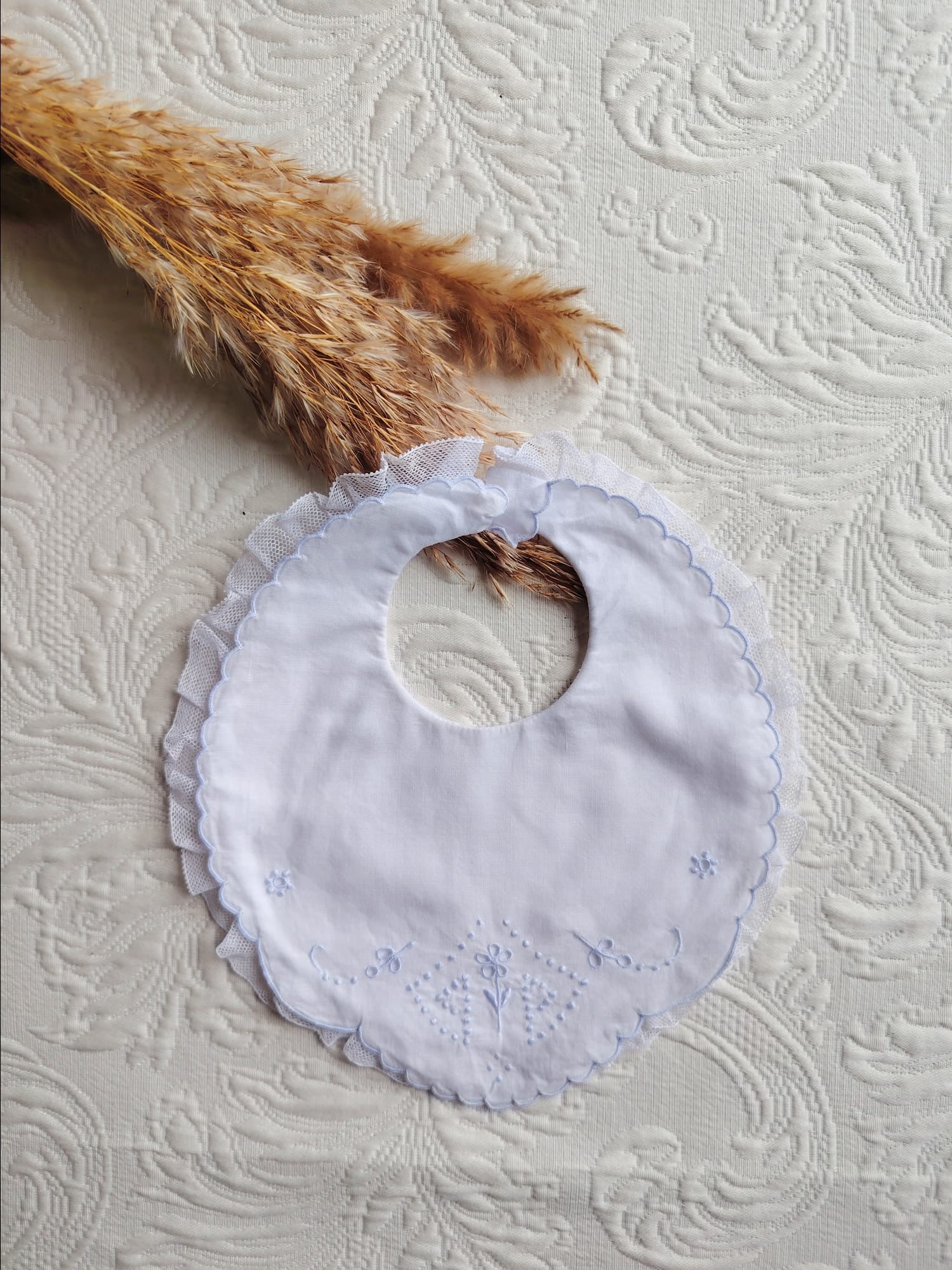 Babero cruzado de primera postura de batista blanco bordado a mano en azul y punta de feston. No admite devolución.