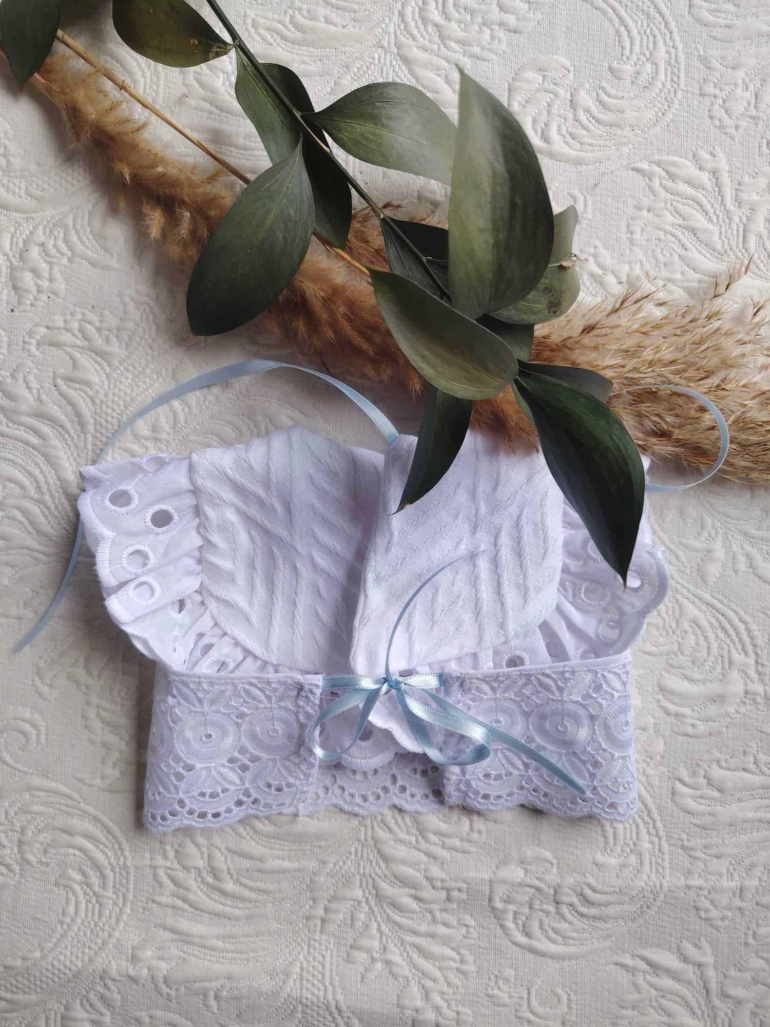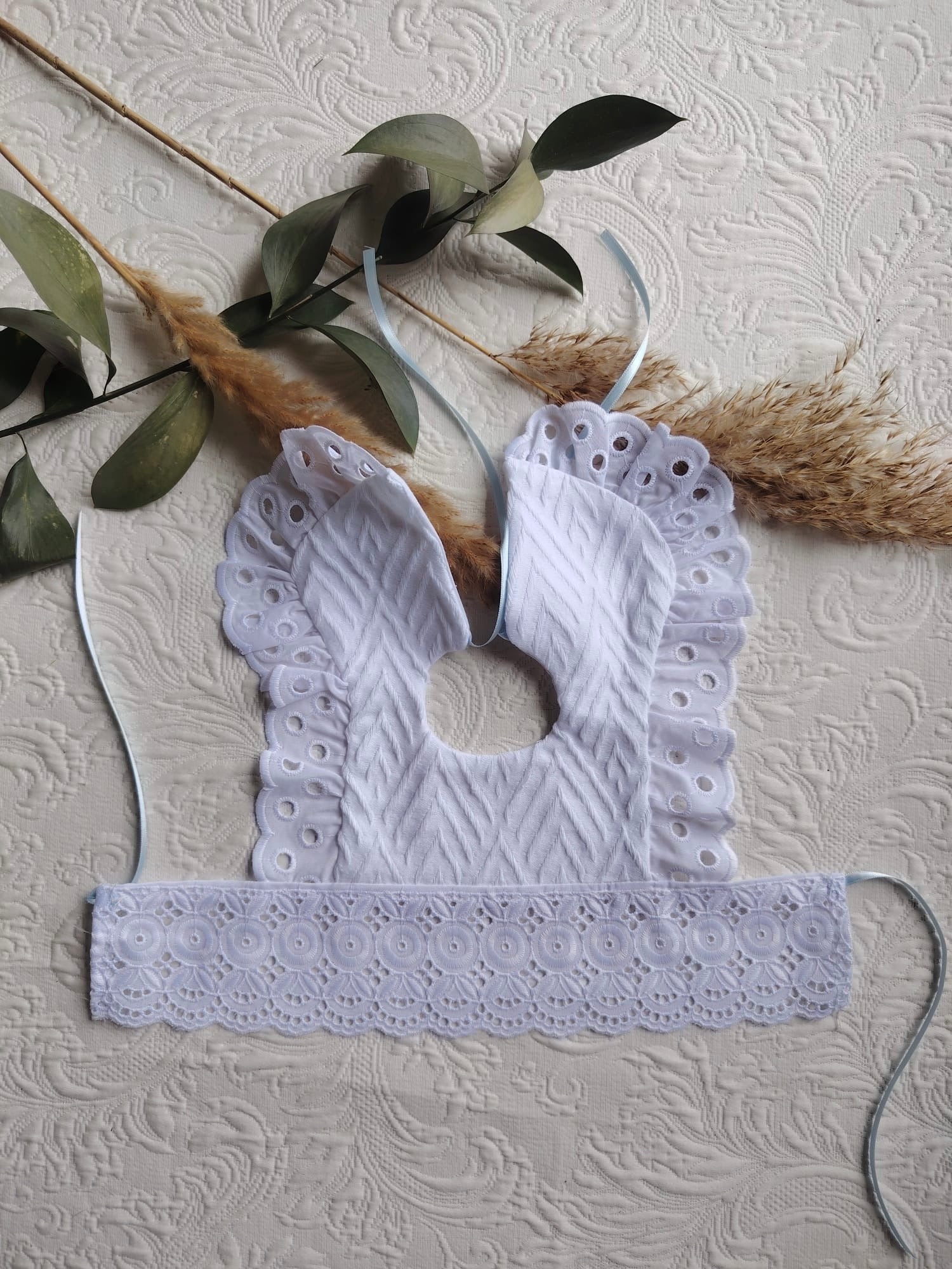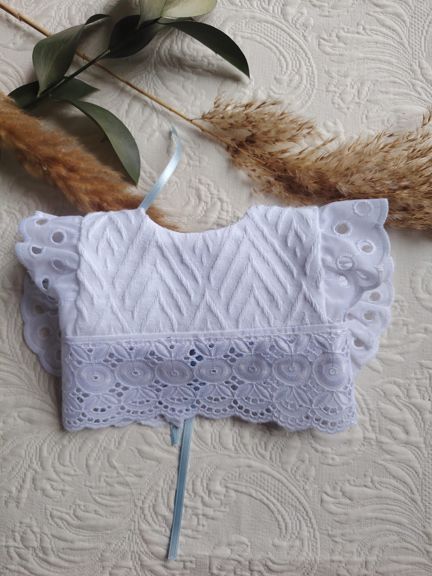 Babero cruzado de piqué dibujo espiga (algodón 100%rematado en tira bordada ancha